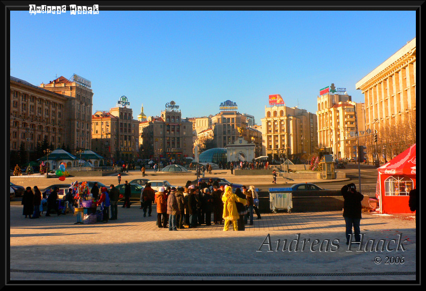 Khreschatyk is the central street in Kiev and passing the famous Nezalezhosti square witch is covered by the famous five houses one one side and the Nezalezhosti victory monument placed on the other side of the Khreschatyk. It features Kievs most famous shopping mall, the Globus, that forms a round shape around Nezalezhosti monument. It has and usual western kitsch to sell and many people visit it like a museum because of the high prices. On the other side we have the five building and place with fountains. The underground has many cafes and piazzas fast food and many sell women stuff, and photographers offering their service. On weekends the Khreschatyk street is closed for traffic and people come together having couple of beers of beer. There is the CENTRALNI MAGAZIN, the central supermarket. It opens like most supermarkets between 9 and 22h. On Sunday the communist where demonstrating.
