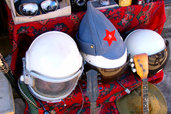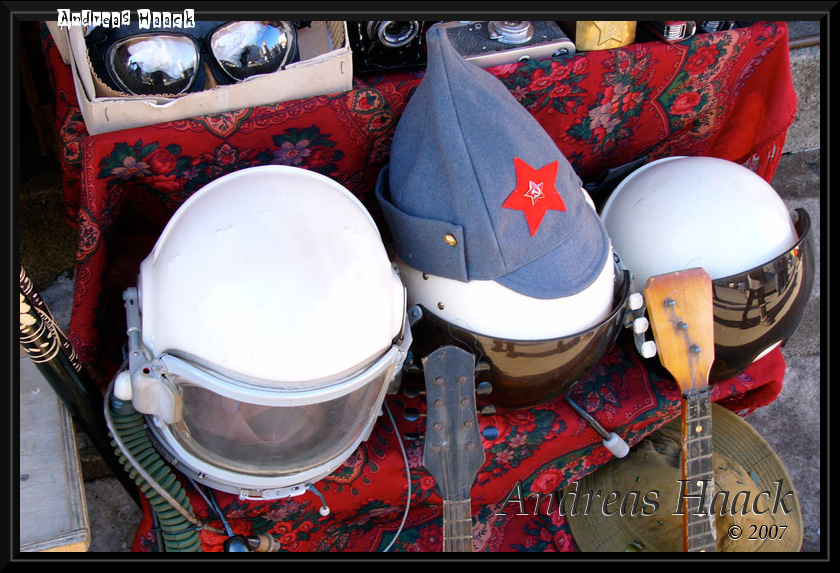 If you continue near Mykhailivs'kyi monastery to the north into Volodymyska street you find a nice flee market. Among other things you one can buy and variety of excellent paintings, newly fabricated Soviet souvenirs and original medals from Soviet Union, Matryoshka dolls (матрёшка), hand craft decorations, Ukrainian flags and a number of military accessories like flight suits, space and fighter jet helmets and hats, aircraft instruments. Paintings are quit nice a large DIN-A2 sized painting costs about 750 UAH nicely framed (150 USD) and 700 UAH (140 USD) without frame. For a invoice (documantation for customs) and extra 20 UAH (5 USD) may be ask. You are offered a variety of military fighter jet helmets. The latest model the ZSh-7 Soviet Flight Helmet, developed in the 1980's and still used to present day is quite rare. At one stand the seller wanted 1000 UAH (200 USD). I wonder how much trouble you would get if the catch you at the customs during exiting the country? The market is all week present, also individual sellers, which speak sometimes a view words English, are present only part of the week. If you continue it goes quite steep down hit one of the oldest and historic streets of Kiev the Andriivs'kyi street. It passes the green roofed Andreevskaya Cathedral.