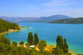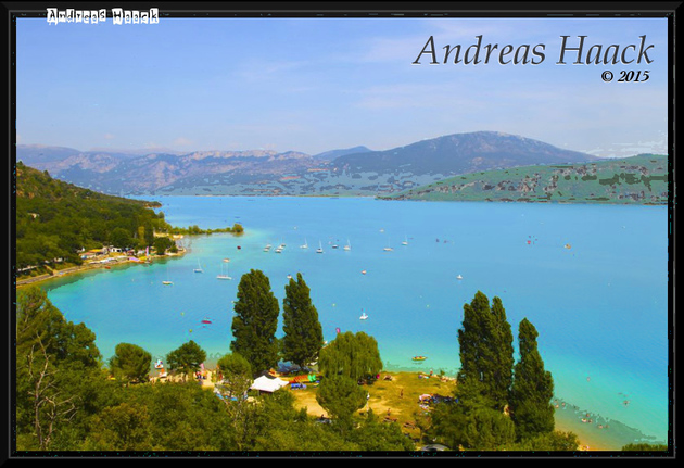 Nun schängeln wir uns die Strässchen runter zum Stausee, ignorieren mehrmals das Navi, das und die unmöglichsten Abkürzungen schicken will. Aber werden wir uns auf den beliebten Stellplatz um 15:00 noch ein Platz bekommen? Schliesslich ist es Anfang Juli und Feriensaison. Als wir ankommen ist der Platz fast leer. Nur fünf Wohnmobile stehen dort. Wir bekommen einen Platz mit sagenhaften Ausblick zum See. Neben uns stehen später dann noch 2 schottische Wohnmobile. Wir unterhalten uns mit den Reisenden, besichtigen das Dorf. Wie schon vor acht Jahren kommt auch wieder die Gendarmerie vorbei spricht jeden an und verteilt ein Pamphlet mit "Sicherheitshinweisen". Wir bekommen eines in deutsch. Lassen keine Wertgegenstände, Dokumente, Jacken, Kameras im Auto steht das zu lesen. Das wirk ein wenig grotesk, denn in einem Wohnmobil hat man zwangsläufig alles dabei.
