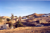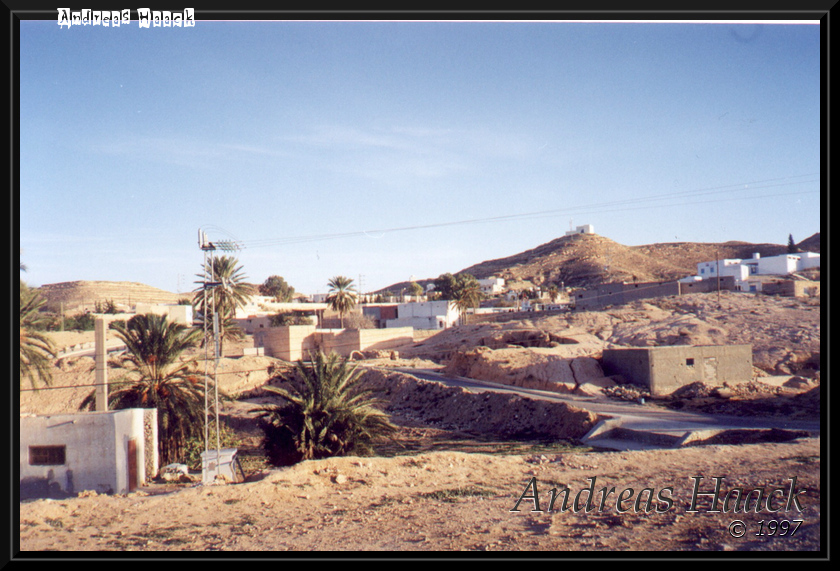ot the Loage station in Gâbes again I tried to get a trip to Matamta. Someone told me that there are no Loages to Matmata and he offered me a trip for 17 TUD in his taxi which is twice to four times as much as a regular taxi would cost. I did not belive him and we I met Kirsten and Dirk. They also want to go to Matmata and we find out the the Loage depart 500m down the to Matmata street. Someone told us that there was also a bus at 12:00h. We just catched the bus which was about to depart when we stopped it. The trip to Matmata costs 1.460 TUD. We traveled the 40 km thru the steppe consisting of loamy soil and ????? vegetation. Matmata is a small village with pour people unpaved roads, that lives mostly on tourism. There are three hotels two of them are made from old Berbers. They digged a large cylinder in to the ground of about 10 meters wide and 5 meters deep. From that center place they digged chambers in to the loamy soil. That ensure that is comfortable cool when it's hot outside and warm in the knight. Indeed it was warm in the night when it was below 10°C out side (with out heating for sure). Those cylinder-living units are connected with tunnels. Today they are used as Hotels and I stayed at the SIDI DRISS. For 10.800 TUD for a night you also get a pretty good lunch and breakfast. Of course this are no first class hotels. There is only cold shower and limited sanitary installation. The hotels are the main attraction. I heard that most organised stupid tourist are coming for a meal and live then. There were only 6 people staying at the SIDI DRISS this night. One British guy who traveled for several month, starting in Turkey and went thru Lebanon, Syria Jordan, Egypt Libia and finally Tunisia. A French couple and and my friends I came with. Dinner was at 18:30 to 21:00h and consist of a tomato-soap a kind of pancake and a truly giant portion of Kuskus, this time supplemented with potatoes and meat.I thought that it already was 1st January and I was not the only one. NO one was sure the watch of one guy was one day ahead so we had a discussion on that and found that it was 31-12-1997. It was not only new years eve but also the 1st day of the Islamic Ramadan. In the evening we went to the local Arabic cafe and there where more people then usual but they don't seem to recognise the Georgian new year and party. We just had a couple of peppermint tee, the local favourite drink.