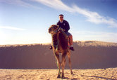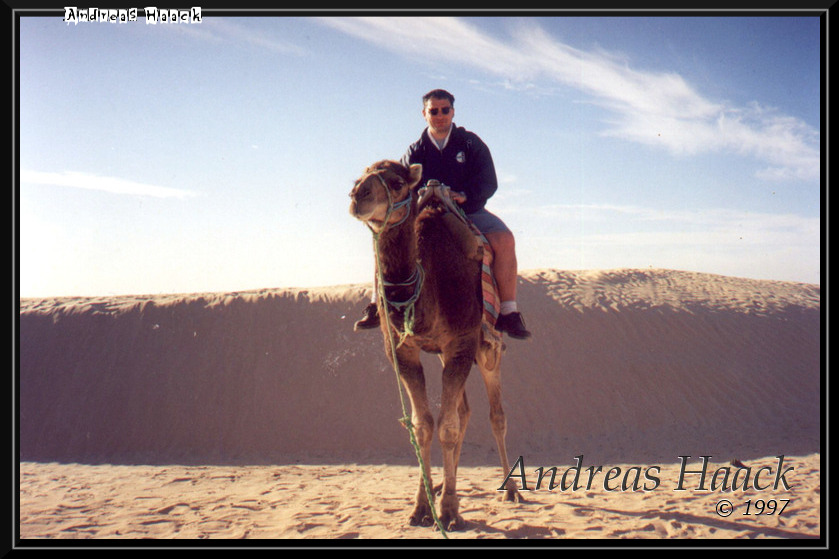 left the hotel and changed some money. At the Loage station close to the hotel I was told that the Loages in direction South depart from the other place next at the train station. It was the usual Renault station wagon, the type of car that is usually used for Loages. I was seated at the rear seat which is a pretty uncomfortable place. I beautiful lady sit next to me. She ask some thing in Arabic and French. We arrived at 11h. in Gâbes. People are much friendlier then in the tourist areas and don't try to trick you for money. I am a passionate Inline-skater. So I took my skates with me and skated thru oasis about 20 km. Traffic consists of tourist-coach shooters (kind of ...). It is pretty silent. Within the oasis the road was fairly smooth concerning of course standard. I talked to the people that sell goods to tourist in the oasis. One could speak a bit German. I learned some Arabic with there help. One wanted to try the Inline skates but could not even stand up on them. Every body had fun and they invited me for to stay. I had some Kuskus a Arabic meal made of HIRSE and CARROTS. I was delicious. I left and got a Louage to SFAX. In Gâbes you have to pay for a Loage ticket at an office and the driver cashes the tickets immediately. We arrived in SFAX at 18:00h witch was rush hour. I tried to get a taxi to get back to the other Loage station were I arrived the other day to go back north. But although there were hundreds of taxis they were all occupied. This was the same like in Tunis. I ended up walking to the other Loage station. A driver told me that the Loages to Sousse depart from the other Loage place, the one I just came from - very funny. I took a taxi back. It was about 19:00h and it is tougher to get all seats full for Loage drivers. This time it was a Renault Espace which is very comfortable compared to the stannard cars. It took half an hour until all seats were occupied. About 500 Meter at a traffic light clutch failed to work and the car did not move a bit. It seemed to be pretty worn-out. So we pushed the car to the other side of the road and the driver tried it again and it worked. So he drove back and I thought we just get another car and he get it to the garage. But he tried it again and it failed again at the traffic light. I the following I learned some lesson about Arabic understantment. Now I would go back or push the car over the corner if I would want to risk break down. We pushed it again over the corner and he drove back and i --- tried it a nother time. But since he has another that he could not go that way he just turned right driving a completely different way!! That is the typical Arabic tack-tick of avoiding problems. The car seemed to be in somewhat bad condition. After about 20 km there was a problem with the wheel suspension. The driver seems to know it and fixed it. All in all we break down six times and he always fixed it again also the distance between failures was declining. Remarkable is that now one was angry. Not the driver and not the passengers. We had a lot of fun and it was the most pleasant trip I had. No one spoke English and I could tell then with my little Arabic language knowledge things an supplement it with gestures. I learned that one was exporting fruits to Europe front Tunis-airport. Four kilometers in front of Sousse we definitely changed the Loages. Everybody paid its 6 TUD - since we finally have arrived no matter if i t took 3 instead of 1.5 hours. And 500 Milliemes four the other guy that brought us to Sousse.
