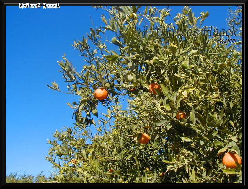 /I changed some money at the reception because the bank was closed (Dirham=DH, 10 DH is one EUR which makes USD). It was sunny and warm, around 20°C. I get three bottles of water (4.5 liter) and start a ride direction to Teima. I find my way out of the city From Agadir I ride on the four lane highway which is of fair quality. Incredible that bike ride here where cars go with around 100km/h. I is not much fun riding here. At a intersection I turn to direction Marakesch. This road was in relatively good condition and less traffic as before but got somewhat hilly with the time. I turned left st the intersection to Teima. This was very rough paved side road, of poor quality. Also there was very little traffic (appr. 2 cars an hour) and the nature was beautiful with the mountains in the background (see photo above). I could only ride around 10km/h. Around Teima there are a lot of orange farms. I drive back the main road which is in rather good condition but had rather strong counter wind and a tremendous amount of stinking traffic. At Ait Melloul I ask the two policeman which pointed me the way down. I reach the city limit at 17:45h around sunset. It is still there quarter of an hour until I reached populated city. After sunset the wind stops. The trip was around 100km and I was pretty exhausted.