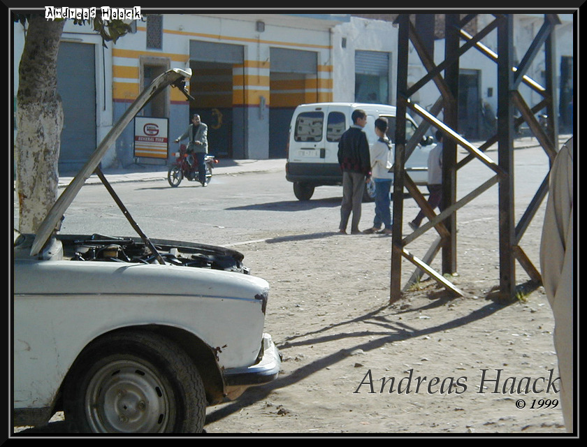 For the strait way out of Agadir direction south just follow Hamman Rue you will reach a round-about with a Shell gas station at the city limit. Just go strait on there is even a bike path at both sides, where pavement is interrupted some times. It is rather fun to ride, depending on the traffic. If you turn right at the barracks before Inezgane you can ride on a silent excellent way for half an hour through the 'Parc National De Sous Massa'. I pass by the Royal Palace which looks impressive. I ask the guard if I can take a picture but he friendly reject my request. It seems to be a military area. Finally I reach the beach. Not that this trip is special in any way but... I drive through Inezgane a dirty average third world town and by a bread for one DH. I continued my way to Ait Meloune thru a terrible traffic jam with all that sinking cars I Ait Melune I again board some bread. On the sidewalk to suspicious guys are walking in my direction one is pointing toward the transformator that crackle and broke witch I was not interested in. The other tried a clumsy to grab my wallet out of my front pocket.
