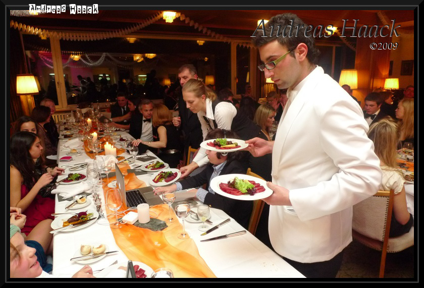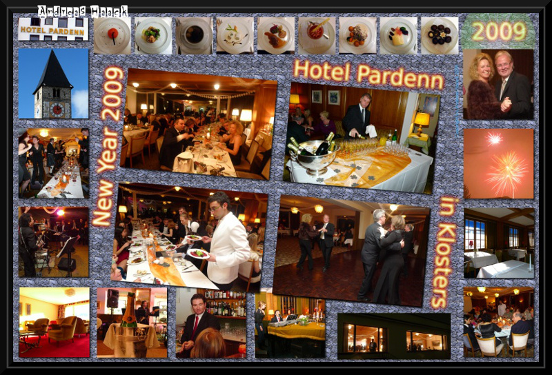 To welcome the New Year in the Hotel Pardenn in Klosters in Switzerland is a special affair. Every year about the same well mixed international audience gather in the noble saloon of the hotel. The evening starts with the champagne reception at 19:00. Most men are nobly dressed according to their origin. For most men this means an elegant evening suit with bow tie. Of course Scottish men come in a kilt and English in a colorful checked outfit. The nice company creates an atmosphere of joy and there is a lot to talk about what happened during the year. At about 20:00 the band starts to play and the nine course dinner is served which plenty of time in between the courses. People entertain and relax between the courses with dancing and small talk. Now it is time to toast the new year with stylish champagne glasses: 10,9,8,7,6,5,4,3,2,1 - Happy New Year! After watching the fireworks dancing continues in the hotel bar.